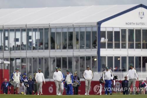 Member of Team Europe walk up the second fairway during a practice day at the Ryder Cup at the Whistling Straits Golf Course Wednesday, Sept. 22, 2021, in Sheboygan, Wis. (AP Photo/Ashley Landis)