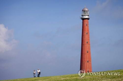 epa09481679 People walk near the Kijkduin lighthouse, commonly referred to as Lange Jaap, in Den Helder, The Netherlands, 22 September 2021. The tower building is in such a bad state that the area within a radius of 70 meters was closed off. During a recent inspection of the lighthouse, it was discovered that larger cracks have formed in the walls, after small cracks had previously been observed. EPA/ROBIN VAN LONKHUIJSEN
