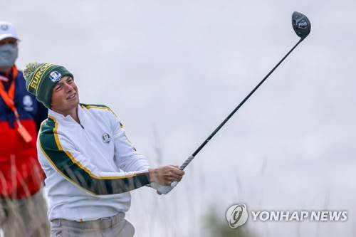 epa09482247 European team member Viktor Hovland of Norway on the fifth hole during a practice round for the pandemic-delayed 2020 Ryder Cup golf tournament at the Whistling Straits golf course in Kohler, Wisconsin, USA, 22 September 2021. Competition for the 43rd Ryder Cup between the US and Europe begins 24 September 2021. EPA/ERIK S. LESSER