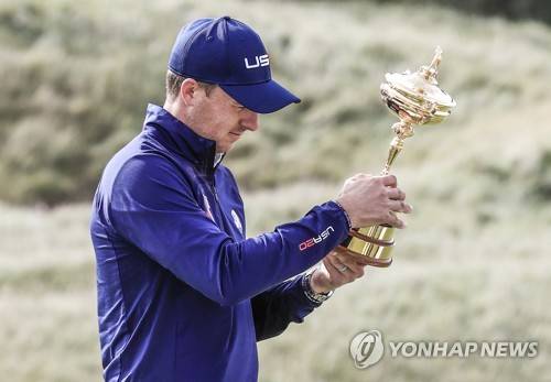 epa09482297 US team member Jordan Spieth looks at the Ryder Cup trophy during the US team photo session at the pandemic-delayed 2020 Ryder Cup golf tournament at the Whistling Straits golf course in Kohler, Wisconsin, USA, 22 September 2021. Competition for the 43rd Ryder Cup between the US and Europe begins 24 September 2021. EPA/TANNEN MAURY