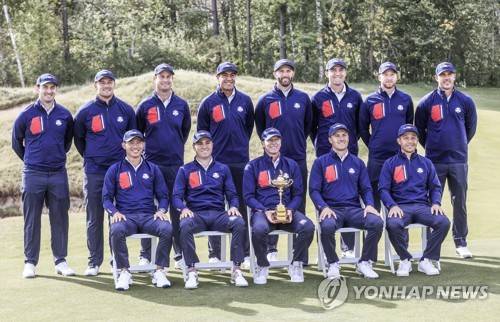 epa09482302 The US team poses with US Team Captain Steve Stricker (C-with trophy) during the US team photo session at the pandemic-delayed 2020 Ryder Cup golf tournament at the Whistling Straits golf course in Kohler, Wisconsin, USA, 22 September 2021. The US team are (B-From Left) Collin Morikawa,Justin Thomas, Jordan Spieth, and Xander Schauffele, (Back from Left) Patrick Cantlay, Bryson DeChambeau, Harris English, Tony Finau, Dustin Johnson, Scottie Scheffler, Daniel Berger, and Brooks Koepka. EPA/TANNEN MAURY