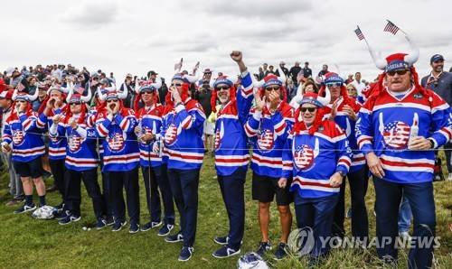 epa09482303 Supporters of the US team cheer on the eleventh fairway during practice for the pandemic-delayed 2020 Ryder Cup golf tournament at the Whistling Straits golf course in Kohler, Wisconsin, USA, 22 September 2021. Competition for the 43rd Ryder Cup between the US and Europe begins 24 September 2021. EPA/TANNEN MAURY