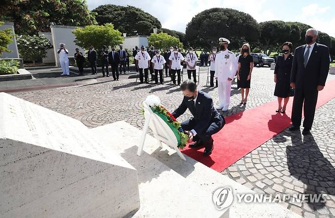 (호놀룰루=연합뉴스) 최재구 기자 = 문재인 대통령이 22일(현지시각) 미국 하와이 펀치볼 국립묘지에서 헌화하고 있다. 2021.9.23
