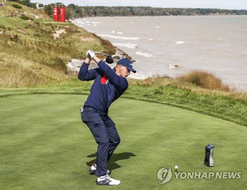 epa09482324 US team member Bryson DeChambeau hits a tee shot on the thirteenth hole beside Lake Michigan during practice for the pandemic-delayed 2020 Ryder Cup golf tournament at the Whistling Straits golf course in Kohler, Wisconsin, USA, 22 September 2021. Competition for the 43rd Ryder Cup between the US and Europe begins 24 September 2021. EPA/TANNEN MAURY