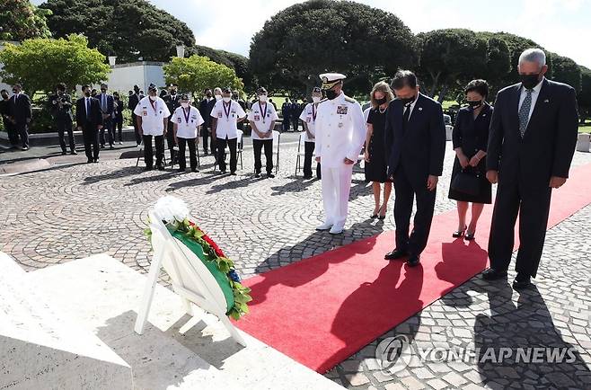 (호놀룰루=연합뉴스) 최재구 기자 = 문재인 대통령이 22일(현지시각) 미국 하와이 펀치볼 국립묘지에서 참배하고 있다. 2021.9.23