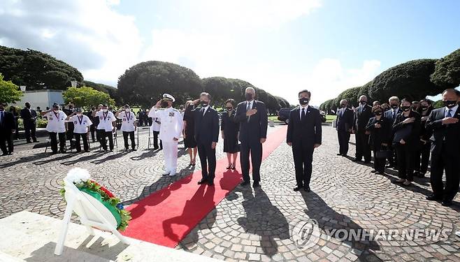 (호놀룰루=연합뉴스) 최재구 기자 = 문재인 대통령이 22일(현지시각) 미국 하와이 펀치볼 국립묘지에서 참배하고 있다. 2021.9.23
