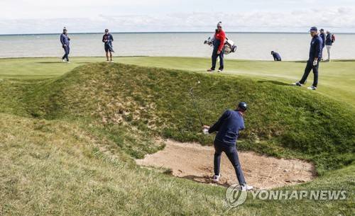 epa09482325 US team member Dustin Johnson hits from a sand trap by the twelfth green during practice for the pandemic-delayed 2020 Ryder Cup golf tournament at the Whistling Straits golf course in Kohler, Wisconsin, USA, 22 September 2021. Competition for the 43rd Ryder Cup between the US and Europe begins 24 September 2021. EPA/TANNEN MAURY