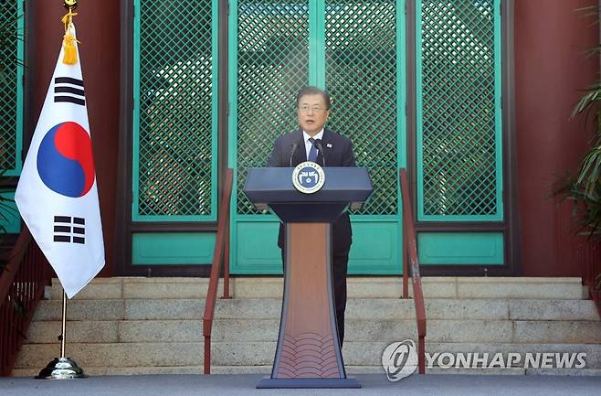 (호놀룰루=연합뉴스) 최재구 기자 = 문재인 대통령이 22일(현지시각) 미국 하와이대 한국학 연구소에서 열린 독립유공자 훈장 추서식에서 발언하고 있다. 2021.9.23