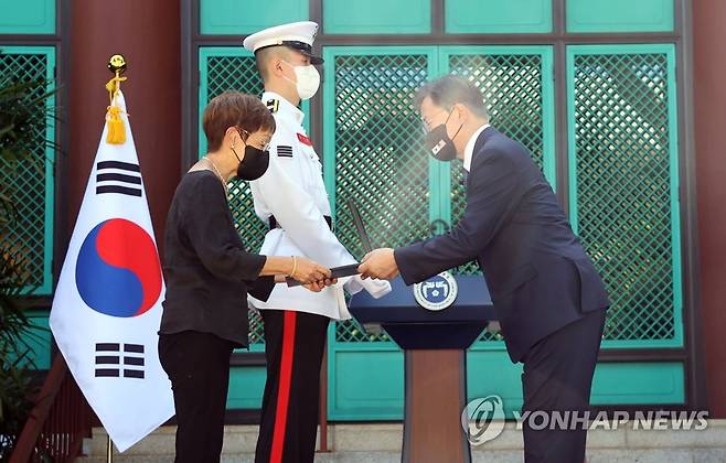 (호놀룰루=연합뉴스) 최재구 기자 = 문재인 대통령이 22일(현지시각) 미국 하와이대 한국학 연구소에서 열린 독립유공자 훈장 추서식에서 독립유공자 안정송 지사 후손에게 애족장을 수여하고 있다. 2021.9.23
