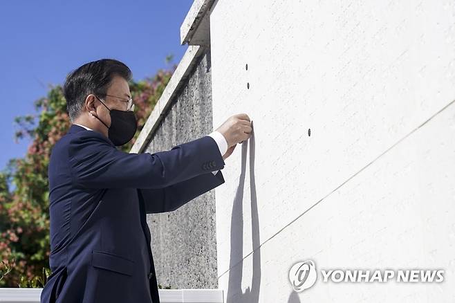 (호놀룰루=연합뉴스) 최재구 기자 = 문재인 대통령이 22일(현지시간) 오전 미국 하와이 펀치볼 국립묘지 한국전 참전 무명용사의 벽에서 신원이 확인된 참전용사의 이름 옆에 로제트 배지를 달고 있다. 2021.9.23