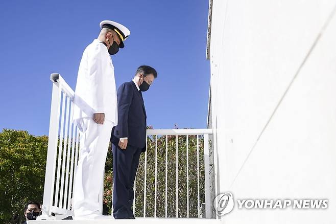 (호놀룰루=연합뉴스) 최재구 기자 = 문재인 대통령이 22일(현지시간) 미국 하와이 펀치볼 국립묘지 무명용사 벽에서 묵념하고 있다. 2021.9.23
