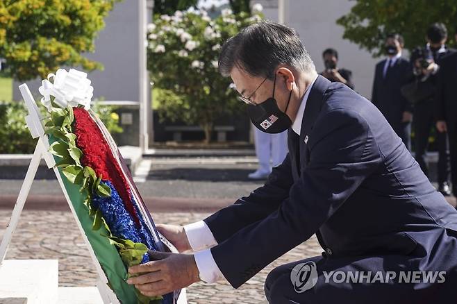 (호놀룰루=연합뉴스) 최재구 기자 = 문재인 대통령이 22일(현지시각) 미국 하와이 펀치볼 국립묘지에서 헌화하고 있다. 2021.9.23