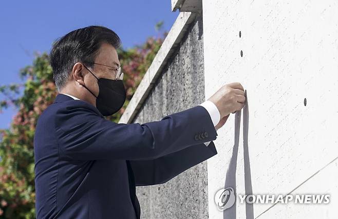 (호놀룰루=연합뉴스) 최재구 기자 = 문재인 대통령이 22일(현지시간) 오전 미국 하와이 펀치볼 국립묘지 한국전 참전 무명용사의 벽에서 신원이 확인된 참전용사의 이름 옆에 로제트 배지를 달고 있다. 2021.9.23