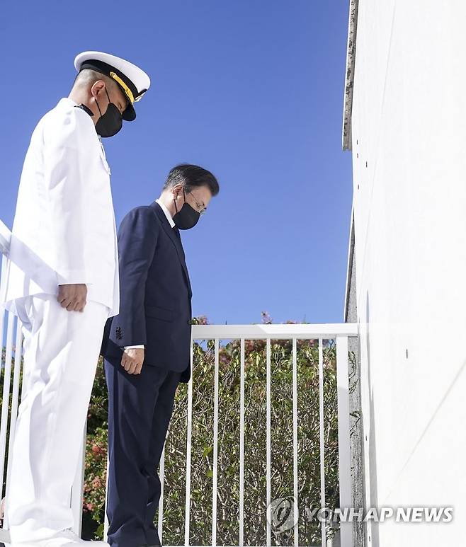 (호놀룰루=연합뉴스) 최재구 기자 = 문재인 대통령이 22일(현지시간) 미국 하와이 펀치볼 국립묘지 무명용사 벽에서 묵념하고 있다. 2021.9.23