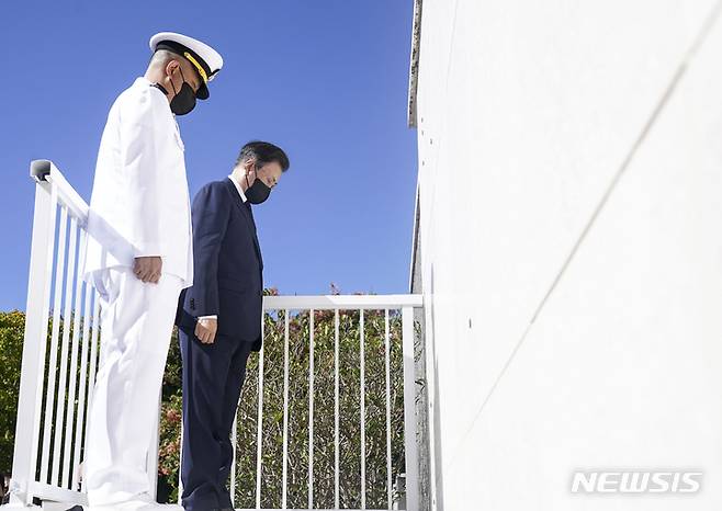 [호놀룰루=뉴시스] 김진아 기자 = 문재인 대통령이 22일(현지시간) 오전 미국 하와이 펀치볼 국립묘지 한국전 참전 무명용사의 벽에서 묵념하고 있다. 2021.09.23. bluesoda@newsis.com