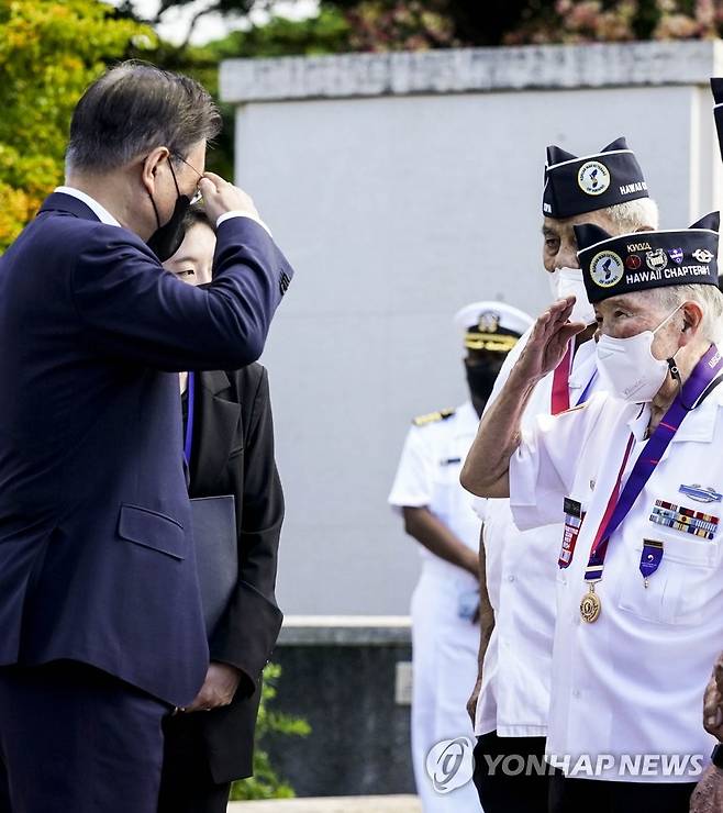 (호놀룰루=연합뉴스) 최재구 기자 = 문재인 대통령이 22일(현지시각) 미국 하와이 펀치볼 국립묘지에서 한국전 참전용사들과 인사하고 있다. 2021.9.23
