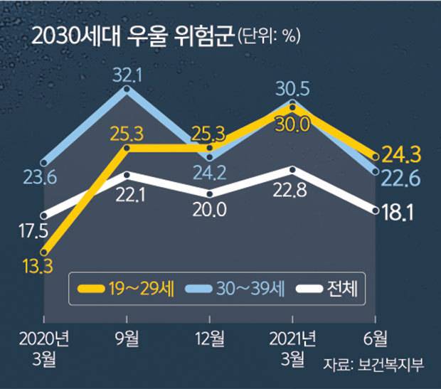 앞서 복지부가 올해 1·2분기에 실시한 ‘코로나19 국민 정신건강 실태조사’에서도 20·30세대의 우울 평균점수와 우울 위험군 비율이 가장 높았다. 20대와 30대의 우울 위험군 비율은 2분기 기준 각각 24.3%와 22.6%로 50·60대(각각 13.5%)에 비해 1.5배 이상 높았다. 젊은 층이 코로나19로 인해 정신건강에 부정적인 영향을 더 많이 받고 있었다. 복지부는 “여전히 우울, 자살 생각 비율이 높은 수준이고, 7월 거리두기 강화 등 방역상황 변화에 따라 심리지원 강화가 필요한 상황”이라며 “마음 건강 회복을 위해 장기적 관점에서 촘촘하게 지원해 나가겠다”고 밝혔다.