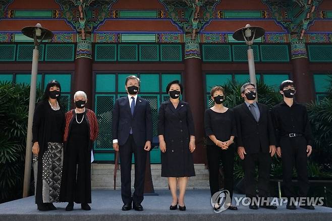 (호놀룰루=연합뉴스) 최재구 기자 = 문재인 대통령과 김정숙 여사가 22일(현지시각) 미국 하와이대 한국학 연구소에서 열린 독립유공자 훈장 추서식에서 애국장과 애족장을 수여받은 독립유공자 김노디 지사 후손, 안정송 지사 후손을 비롯한 참석자들과 기념촬영을 하고 있다. 2021.9.23
