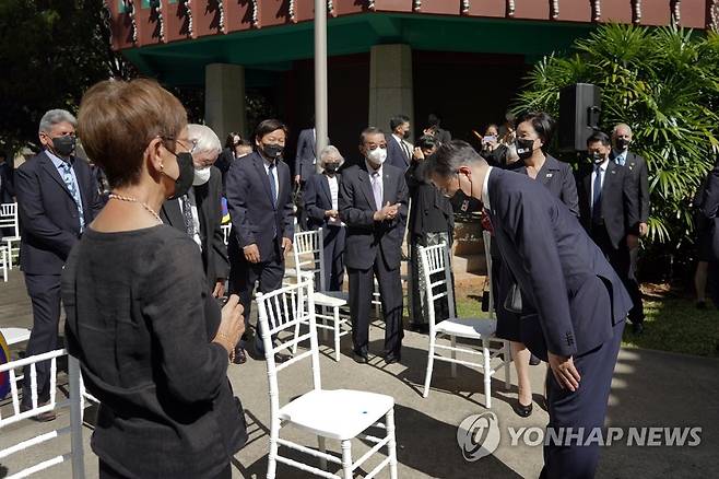 (호놀룰루=연합뉴스) 최재구 기자 = 문재인 대통령이 22일(현지시각) 미국 하와이대 한국학 연구소에서 열린 독립유공자 훈장 추서식에서 참석자들에게 인사하고 있다. 2021.9.23