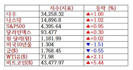 뉴욕증권거래소에서 다우지수는 22일(현지 시각) 전장보다 1% 오른 34,258.32로 거래를 마쳤다. 스탠더드앤드푸어스 500지수는 전장보다 0.95% 상승한 4,395.64로, 기술주 중심의 나스닥지수도 전장보다 1.02% 오른 14,896.85로 장을 마감했다.