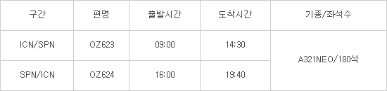 표. 인천-사이판 여객편 운항 스케줄 (주1회, 토요일)