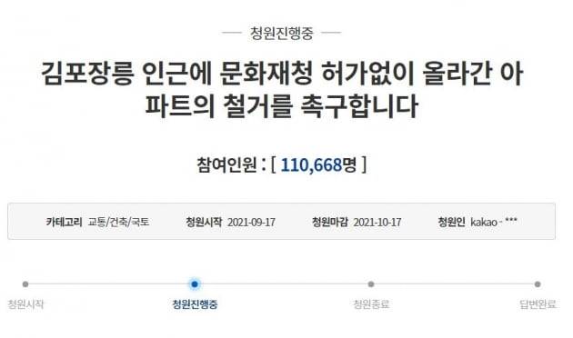 23일 청와대 국민청원 홈페이지에 따르면 지난 17일 게시판에는 '김포장릉 인근에 문화재청 허가 없이 올라간 아파트의 철거를 촉구합니다'라는 글이 올라왔다. 해당 청원은 이날 오전 9시23분 기준 참여인원이 11만668명을 기록했다.