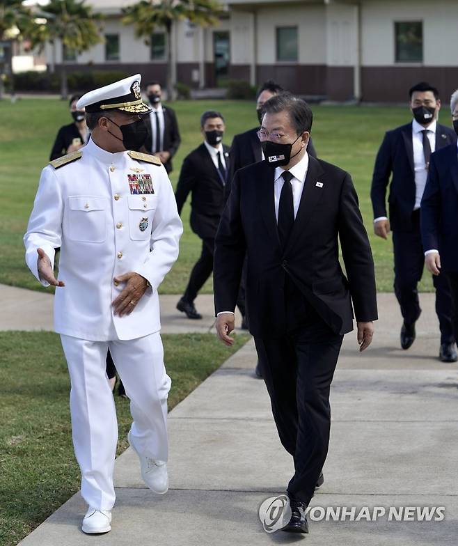 (호놀룰루=연합뉴스) 최재구 기자 = 문재인 대통령이 22일(현지시각) 미국 히캄 공군기지에서 아퀼리노 인도태평양사령관과 접견실로 이동하고 있다. 2021.9.23