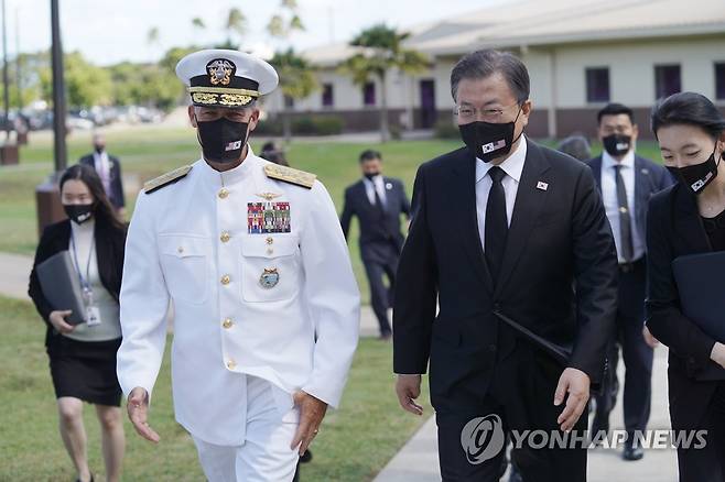 (호놀룰루=연합뉴스) 최재구 기자 = 문재인 대통령이 22일(현지시각) 미국 히캄 공군기지에서 아퀼리노 인도태평양사령관과 접견실로 이동하고 있다. 2021.9.23