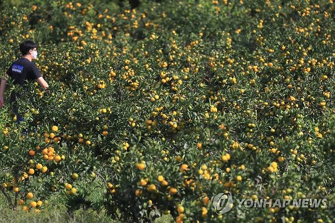 (제주=연합뉴스) 박지호 기자 = 23일 오전 제주시 노형동의 한 농장에서 감귤이 노랗게 익어가고 있다. 2021.9.23