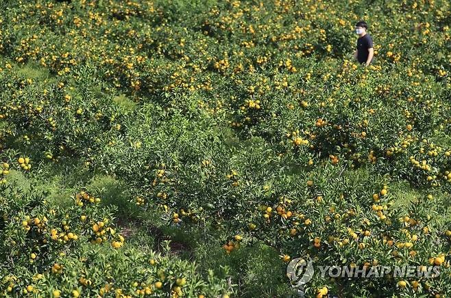 (제주=연합뉴스) 박지호 기자 = 23일 오전 제주시 노형동의 한 농장에서 감귤이 노랗게 익어가고 있다. 2021.9.23