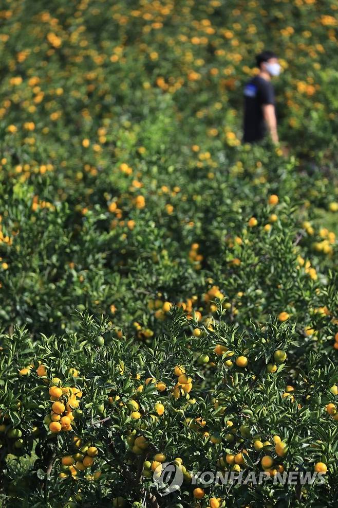 (제주=연합뉴스) 박지호 기자 = 23일 오전 제주시 노형동의 한 농장에서 감귤이 노랗게 익어가고 있다. 2021.9.23