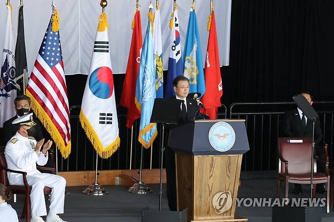 (호놀룰루=연합뉴스) 최재구 기자 = 문재인 대통령이 22일(현지시각) 미국 히캄 공군기지 19번 격납고에서 열린 한미 유해 상호 인수식에서 추모사를 하고 있다. 2021.9.23