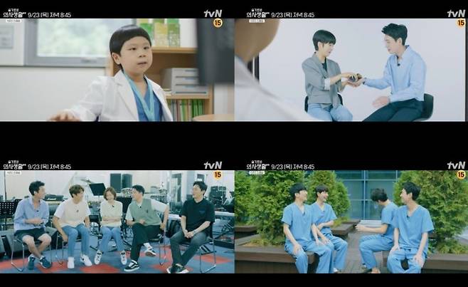 ‘슬기로운 의사생활 시즌 2 스페셜’에서는 다시 합주실에 모인 99즈의 인터뷰를 통해 공개되는 비하인드 스토리부터 율제병원 곳곳에서 각 과별로 뭉친 99즈와 전공의들의 인터뷰를 준비, 본 방송과는 또 다른 재미와 감동을 선사할 것으로 보인다. 특히 공개된 예고편에서는 익준(조정석 분)의 아들 우주 역으로 사랑을 받은 배우 김준이 율제병원의 의사 선생님으로 등장해 시선을 사로잡았다.. 의사 가운을 입고 등장한 김준이 호기심 가득한 똘망똘망 눈빛으로 보는 화면 속에는 다채로운 조합으로 인터뷰를 하는 ‘슬기로운 의사생활’ 배우들의 모습이 담겨있어 호기심을 자극하며 이들이 털어놓을 비하인드 스토리를 더욱 궁금하게 만든다.