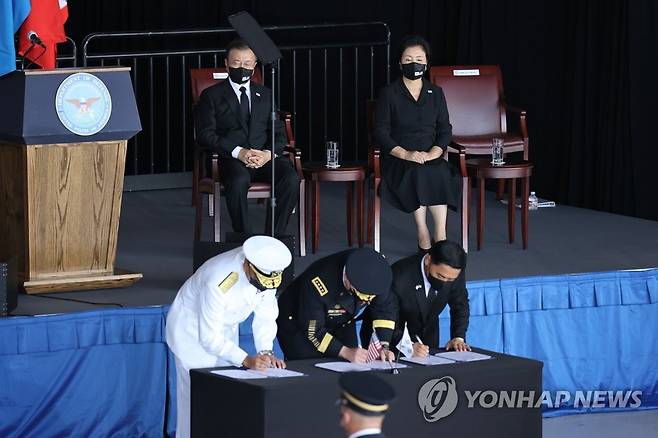 (호놀룰루=연합뉴스) 최재구 기자 = 문재인 대통령이 22일(현지시각) 미국 히캄 공군기지 19번 격납고에서 열린 한미 유해 상호 인수식에서 허욱구 국방부 유해발굴단장, 폴 라캐머라 주한미군사령관, 다리우스 바나지 DPAA(미국 전쟁포로 및 실종자 확인국) 부국장이 유해 인수인계서에 서명하는 모습을 지켜보고 있다. 2021.9.23