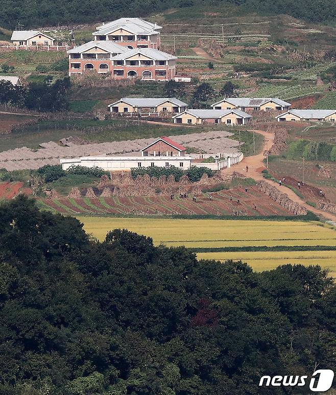 (서울=뉴스1) 박세연 기자 = 23일 경기도 파주시 접경지역에서 바라본 북한 황해북도 개풍군 탈곡장 인근에서 북한 주민들이 농사일로 분주한 모습을 보이고 있다.