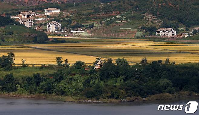 (서울=뉴스1) 박세연 기자 = 23일 경기도 파주시 접경지역에서 바라본 북한 황해북도 개풍군 북한 군초소가 적막한 모습을 보이고 있다, 군 초소 뒤로 들녘이 황금빛으로 물들고 있다.
