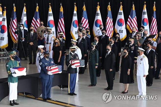 (호놀룰루=연합뉴스) 최재구 기자 = 문재인 대통령과 김정숙 여사가 참석한 가운데 22일(현지시각) 미국 히캄 공군기지 19번 격납고에서 열린 한미 유해 상호 인수식에서 의장병이 유해를 항공기로 운구하고 있다. 2021.9.23