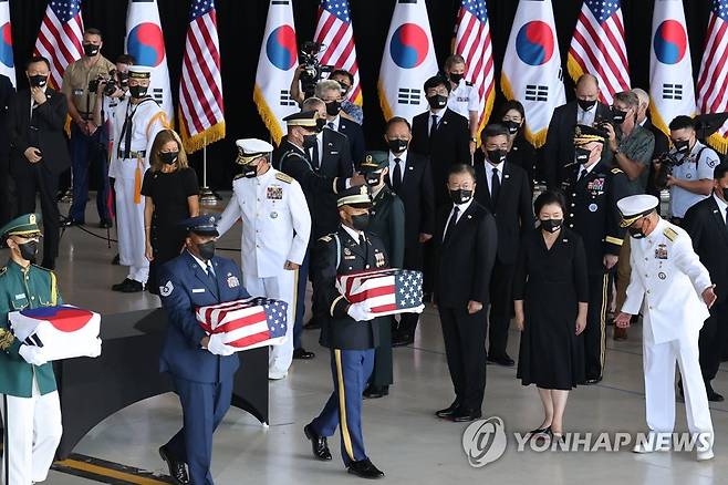 (호놀룰루=연합뉴스) 최재구 기자 = 문재인 대통령과 김정숙 여사가 참석한 가운데 22일(현지시각) 미국 히캄 공군기지 19번 격납고에서 열린 한미 유해 상호 인수식에서 의장병이 유해를 항공기로 운구하고 있다. 2021.9.23