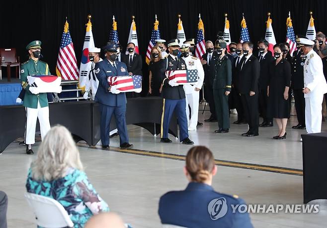 (호놀룰루=연합뉴스) 최재구 기자 = 문재인 대통령과 김정숙 여사가 22일(현지시각) 미국 히캄 공군기지 19번 격납고에서 열린 한미 유해 상호 인수식에서 유해 인수인계 과정을 지켜보고 있다. 2021.9.23