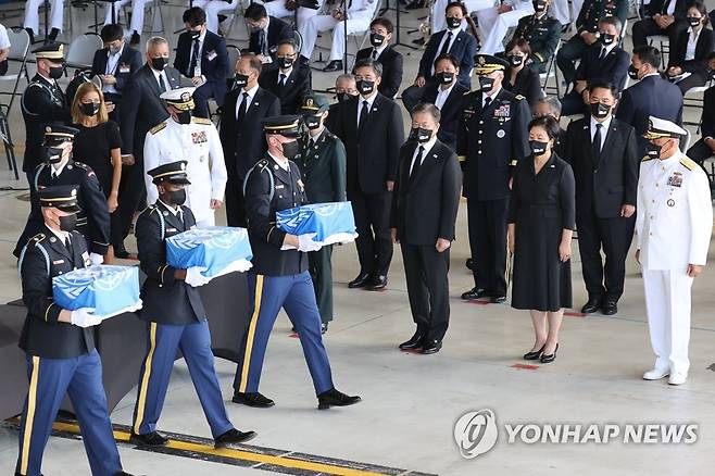 (호놀룰루=연합뉴스) 최재구 기자 = 문재인 대통령과 김정숙 여사가 참석한 가운데 22일(현지시각) 미국 히캄 공군기지 19번 격납고에서 열린 한미 유해 상호 인수식에서 의장병이 유해를 항공기로 운구하고 있다. 2021.9.23