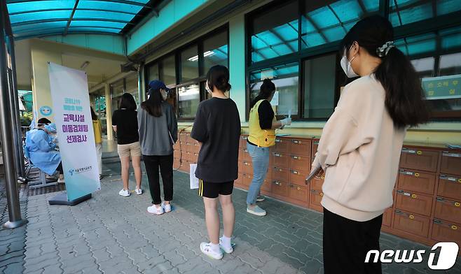 (서울=뉴스1) 박지혜 기자 = 23일 오전 서울 중구 금호여자중학교에 추석 연휴 이후 학생 확진자 확산을 막기 위해 마련된 이동식 PCR 검사소에서 학생과 교직원들이 검사를 받기 위해 줄지어 기다리고 있다.