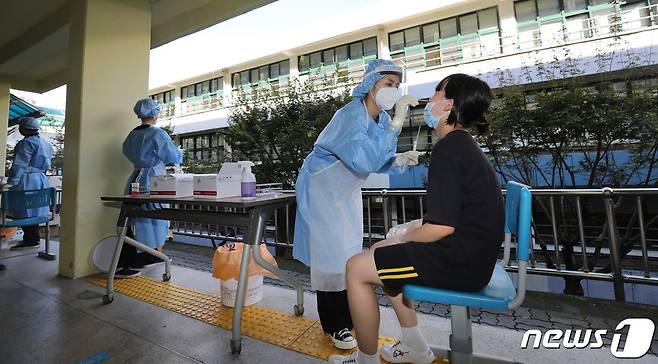 (서울=뉴스1) 박지혜 기자 = 23일 오전 서울 중구 금호여자중학교에 추석 연휴 이후 학생 확진자 확산을 막기 위해 마련된 이동식 PCR 검사소에서 학생이 신종 코로나 바이러스 감염증(코로나19) 검사를 받고 있다.