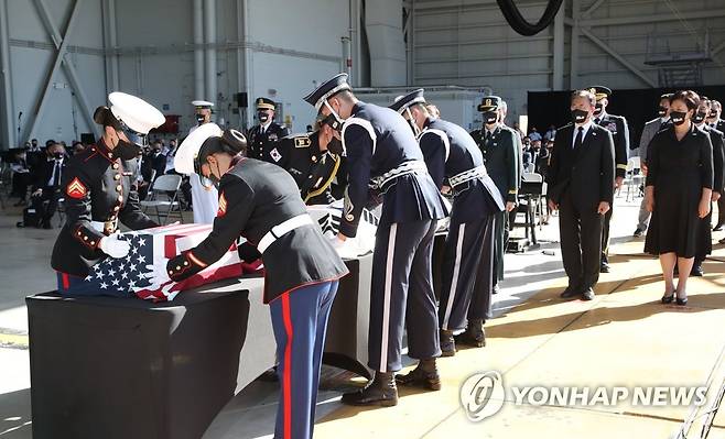 (호놀룰루=연합뉴스) 최재구 기자 = 문재인 대통령과 김정숙 여사가 22일(현지시각) 미국 히캄 공군기지 19번 격납고에서 열린 한미 유해 상호 인수식에서 유해 관포 교체를 지켜보고 있다. 2021.9.23
