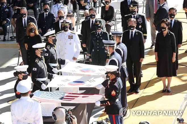 (호놀룰루=연합뉴스) 최재구 기자 = 문재인 대통령과 김정숙 여사가 22일(현지시각) 미국 히캄 공군기지 19번 격납고에서 열린 한미 유해 상호 인수식에서 유해 관포 교체를 지켜보고 있다. 2021.9.23
