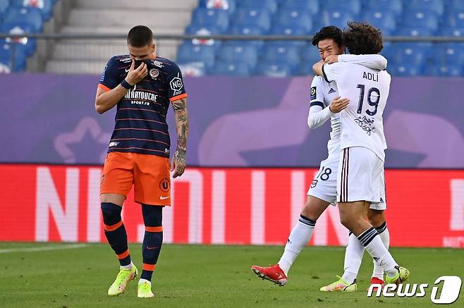 (몽펠리에 AFP=뉴스1) 우동명 기자 = 보르도의 황의조가 22일(현지시간) 프랑스 몽펠리에의 스타드 드 모손에서 열린 리그1 몽펠리에와의 경기서 2경기 연속 골로 시즌 3호 골을 터트린 뒤 동료 야신 아들리와 포옹을 하고 있다.