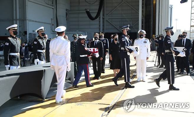 (호놀룰루=연합뉴스) 최재구 기자 = 문재인 대통령과 김정숙 여사가 참석한 가운데 22일(현지시각) 미국 히캄 공군기지 19번 격납고에서 열린 한미 유해 상호 인수식에서 의장병이 유해를 항공기로 운구하고 있다. 2021.9.23