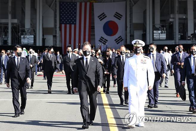 (호놀룰루=연합뉴스) 최재구 기자 = 문재인 대통령과 아퀼리노 인도태평양사령관이 22일(현지시각) 미국 히캄 공군기지 19번 격납고에서 열린 한미 유해 상호 인수식을 마친 뒤 공군 1호기로 이동하고 있다. 2021.9.23