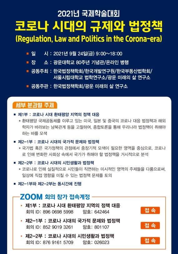 광운대학교가 후원하는 이번 국제 학술대회는 한국법정책학회와 광운 미래의 삶 연구소가 공동으로 주관하며 한국법정책학회, 광운 미래의 삶 연구소, 한국개발연구원, 한국부동산법학회, 서울시립대 법학연구소가 공동 주최로 참여한다. 주제는 코로나 시대의 지역과 국가 시민들의 생활과 밀접하게 관련된 법 정책에 관한 것이다.