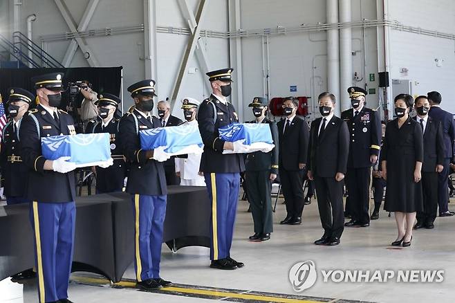 (호놀룰루=연합뉴스) 최재구 기자 = 문재인 대통령과 김정숙 여사가 참석한 가운데 22일(현지시각) 미국 히캄 공군기지 19번 격납고에서 열린 한미 유해 상호 인수식에서 의장병이 유해를 항공기로 운구하고 있다. 2021.9.23