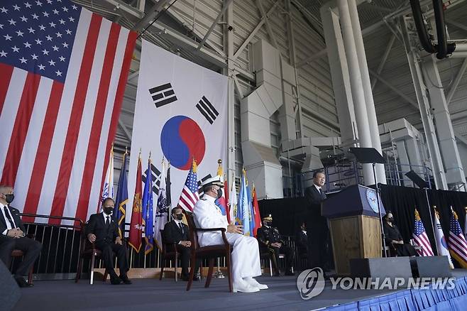 (호놀룰루=연합뉴스) 최재구 기자 = 문재인 대통령이 22일(현지시각) 미국 히캄 공군기지 19번 격납고에서 열린 한미 유해 상호 인수식에서 추모사를 하고 있다. 2021.9.23